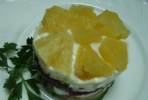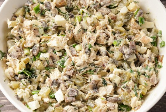куриное филе, яйцо, грибы маринованные, сыр, корнишоны, ананас консервированный, салат, майонез, зелень
