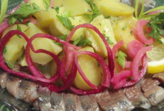 слабосоленая селедочка, отварной картофель, маринованный лук, зелень