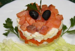 семга, картофель, морковь, яйцо, марин. огурец, майонез