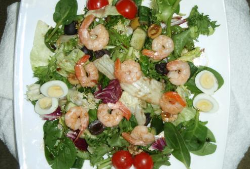 салат-микс, тигровая креветка, яйцо перепелиное, черри, соус цезарь, бекон, сыр, сухарики