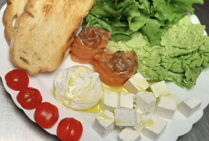 семга слабосоленая, яйцо пашот, сыр Фетаки, смесь салатов, черри, чиабата хрустящая, оливковое масло