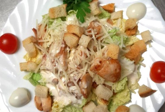 салат-микс, куриное филе, яйцо перепелиное, помидоры черри, бекон, соус цезарь, сыр, сухарики