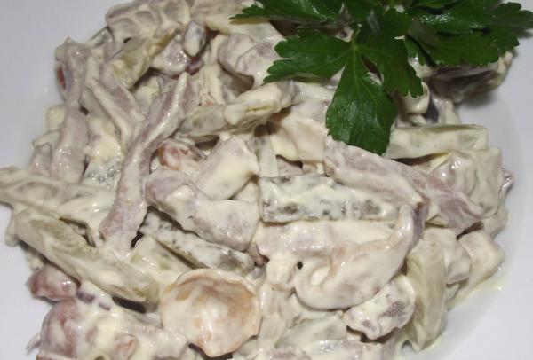 китайский салат марин. огурец, язык говяжий, грибы маринованные зелень, черри, майонез
